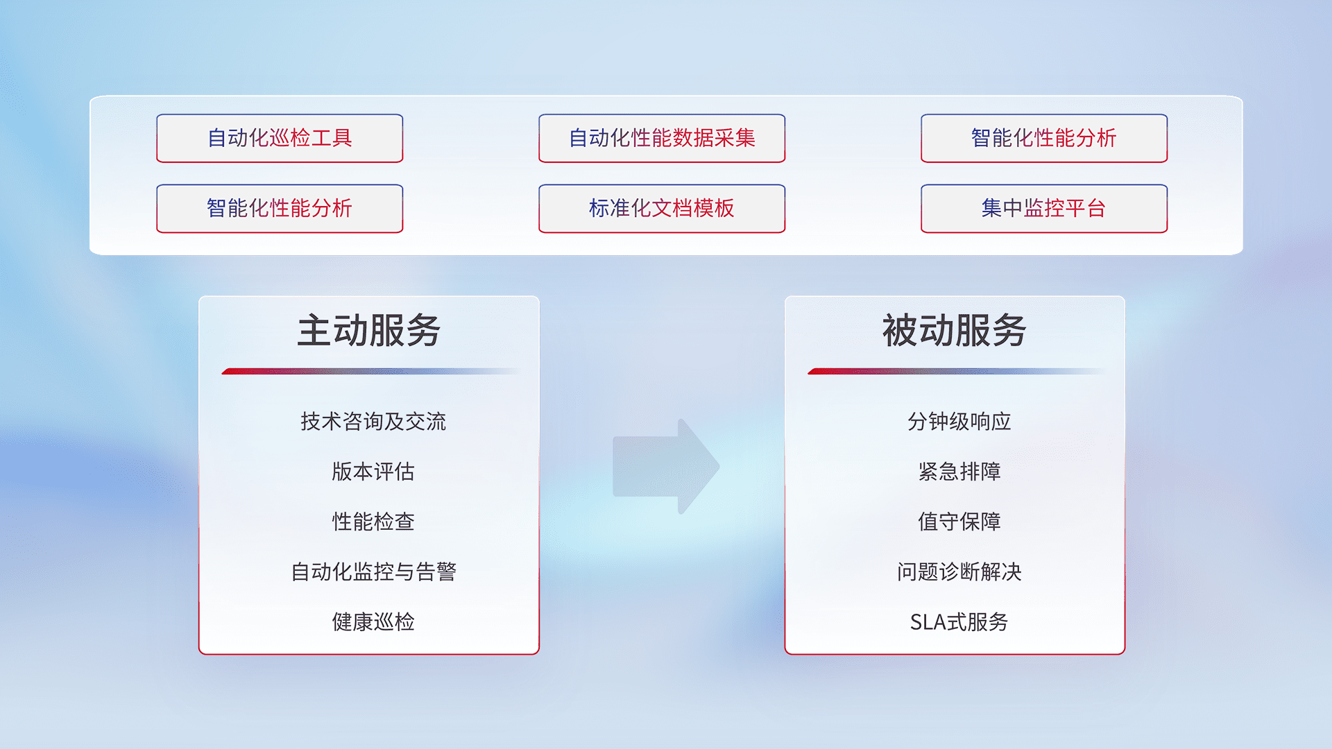 智能化工具和标准化文档,,保障服务质量,,,,提供主动服务(包含技术咨询、、、版本评估、、、、性能检查、、、自动化监控与告警、、、、健康巡检)和被动服务包含(分钟级响应、、、、紧急排障、、、、值守保障、、问题诊断解决、、、、SLA服务)。。