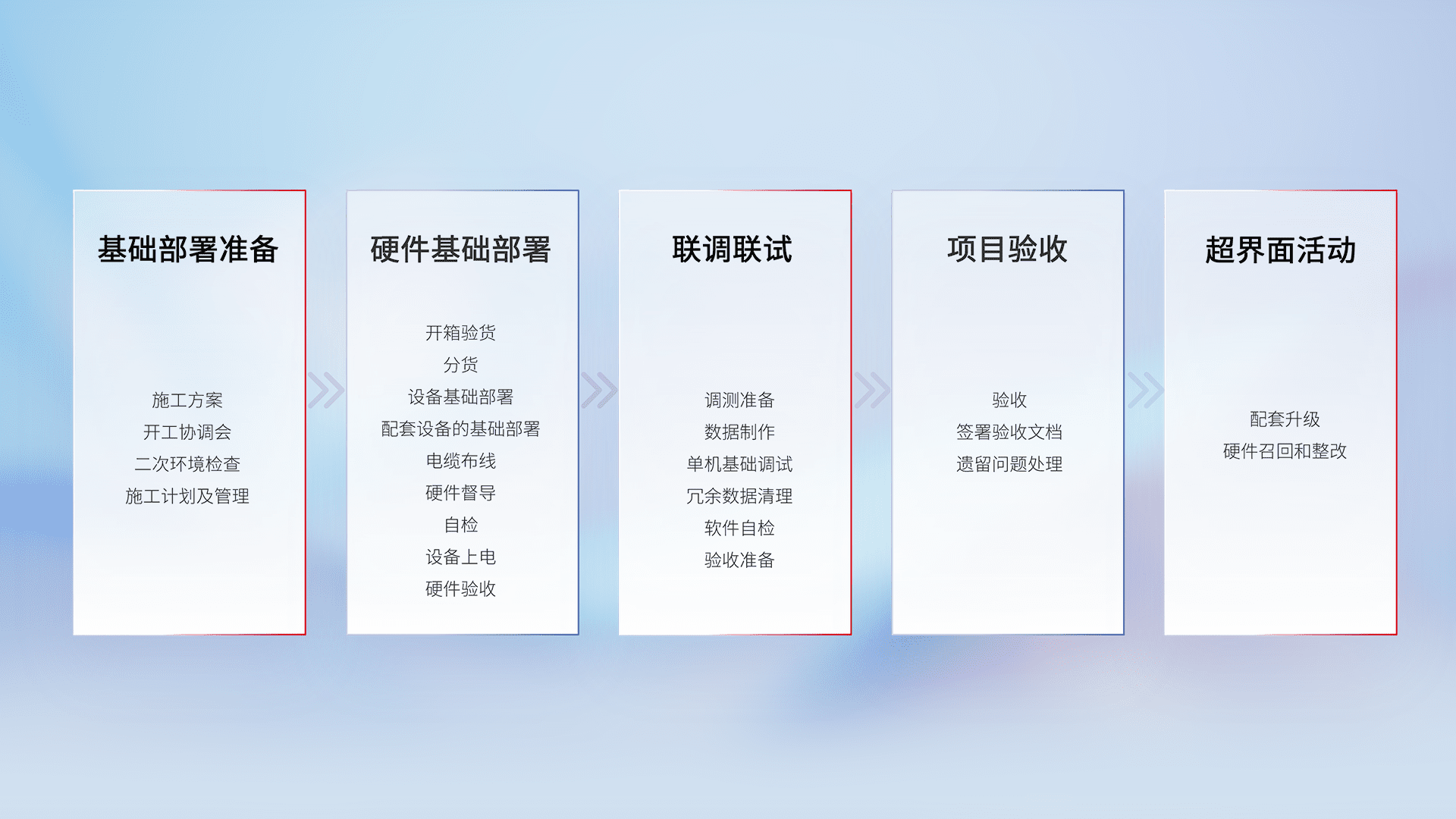 从基础部署准备、、、、硬件基础部署、、、联调联试、、、、项目验收、、越界面活动的全过程可追溯,,,保证施工质量和进度。。。。